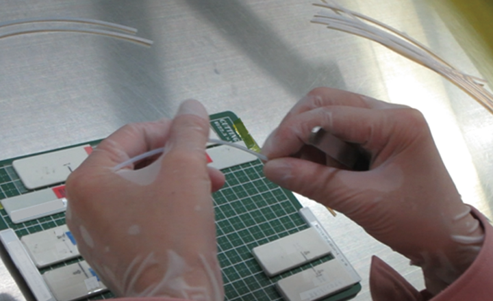 多い時は、一度に3,000から4,000枚のラップアラウンドテープを印字します。出力したテープは、熟練の作業者が、オリジナルの作業板にチューブをセットし、ピンセットを使ってラップアラウンドテープをチューブの指定の位置に貼っていきます。図面の種類は100種類を超えるほど。