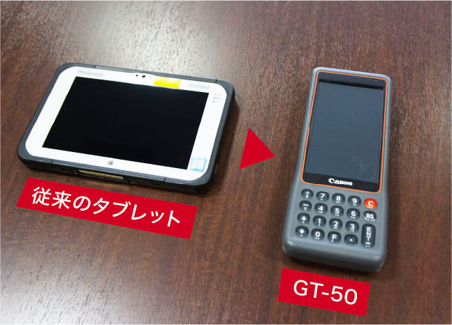 喜納氏は「次の端末を選ぶ上で大前提となったのは、タブレットで使っていたWindows10アプリケーションを移植してそのまま利用できること。この要件に合致したのが、キヤノンマーケティングジャパン(以下、キヤノンMJ)の方にご紹介いただいたGT-50です。GT-50であれば、OSも同じWindows10ですし、物理キーも付いていて、画面のタッチパネルと併用できる。キヤノンMJから実機をお借りしてアプリケーションの移植がうまくいくか試してみたところ特に問題はなく、さらにモバイルプリンターもそのまま使用可能ということで、GT-50の採用を決定しました」。