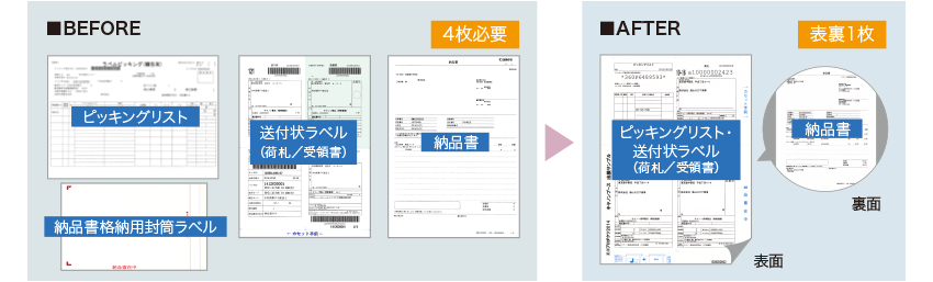 伝票3枚と商品に添付する封筒の合計4点を、表裏二層構造の1枚に集約し、伝票一体型ラベルによる業務プロセスを新たに構築した。
