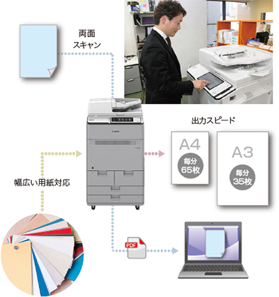 「電源を入れてからの立ち上がりも早く、A4で毎分65枚、A3でも毎分35枚という出力スピードは、プレゼン前などファイル数冊分にも及ぶ資料を用意しなければならないこともある当社にとっては最適でした」。