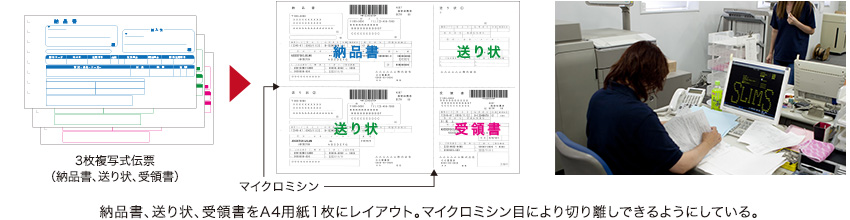 以前は朝6時半ぐらいに出社して連続紙をセットする作業が必要でした。また、複写式は3枚構成でしたが現在は1枚に集約され、切断する手間も省けたので、全体的な工程がかなり削減できています。
