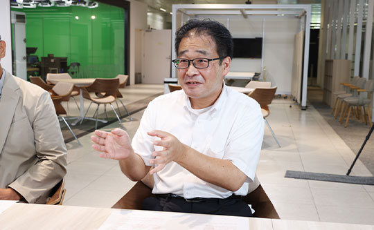 2019年頃から当時の「キヤノン製品のラインアップ展示をするショールーム」の機能性に限界を感じてきており、社内でリニューアルを検討し始めていました。当初はスタジオ機能のない単なる「イノベーションスペース」に改装する予定でしたが、2020年の年初より新型コロナウイルスが蔓延し始め、人が集まるリアルイベントやセミナーが軒並み中止に追い込まれました。「このままではキヤノンMJグループの情報が発信できなくなる」と痛感させられたことで方向転換し、オンラインスタジオを装備した施設としてリニューアルすることにしたのです。実は以前から各部署でオンラインセミナーなどの個別の行事を、社内の会議室を使って行ってはいました。しかし、会社としての本格的なスタジオ設備はなかったため、内製化の実現も考慮しつつ本腰を入れて整備しようという流れになった経緯があります。