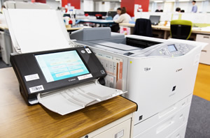 各社の製品をいろいろ検討しましたが、パソコンレスで、なおかつ十分な性能を持ったスキャナーというと限られていましたし、さらに他社の製品はサイズがA3と大きかったんですね。その点、キヤノンのスキャナーは設置サイズがA4と小型で、簡単な操作性がポイントになりました。