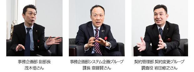 詳しい背景やシステム導入の決め手になったこと、導入前と後で具体的に業務がどのように変わったのかなどについて、今回のプロジェクトを主導した事務企画部 副部長の茂木氏と課長の齋藤氏、実際にシステムを利用している契約管理部調査役の岩田氏の御三方に伺いました。
