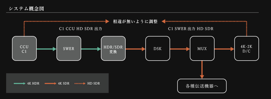 高校野球はHD/SDRの放送ですが将来的な4K/HDRの放送も見据えてサイマル制作を行っています。logのままスイッチャーを介して、検証用として4K/HDRの素材をサーバーに溜め込み、変換して出てきたSDRをスカパー!で放送しました。