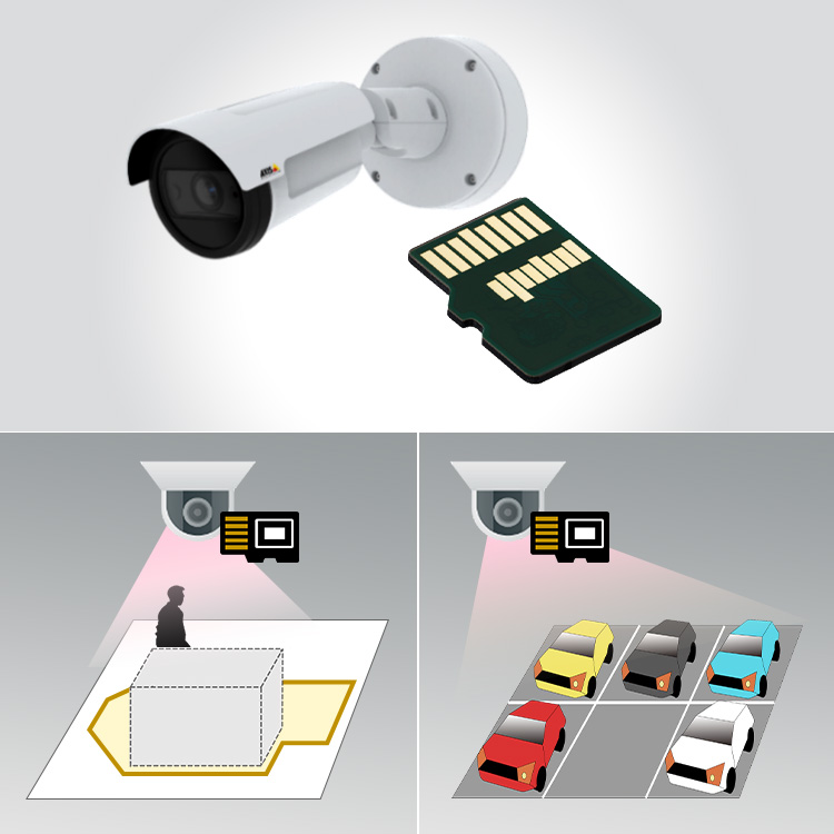 対象のアクシス製カメラ本体のmicroカードスロットに挿入し、専用映像解析アプリケーションをインストールすることで、AIを活用した映像解析を容易に実現。