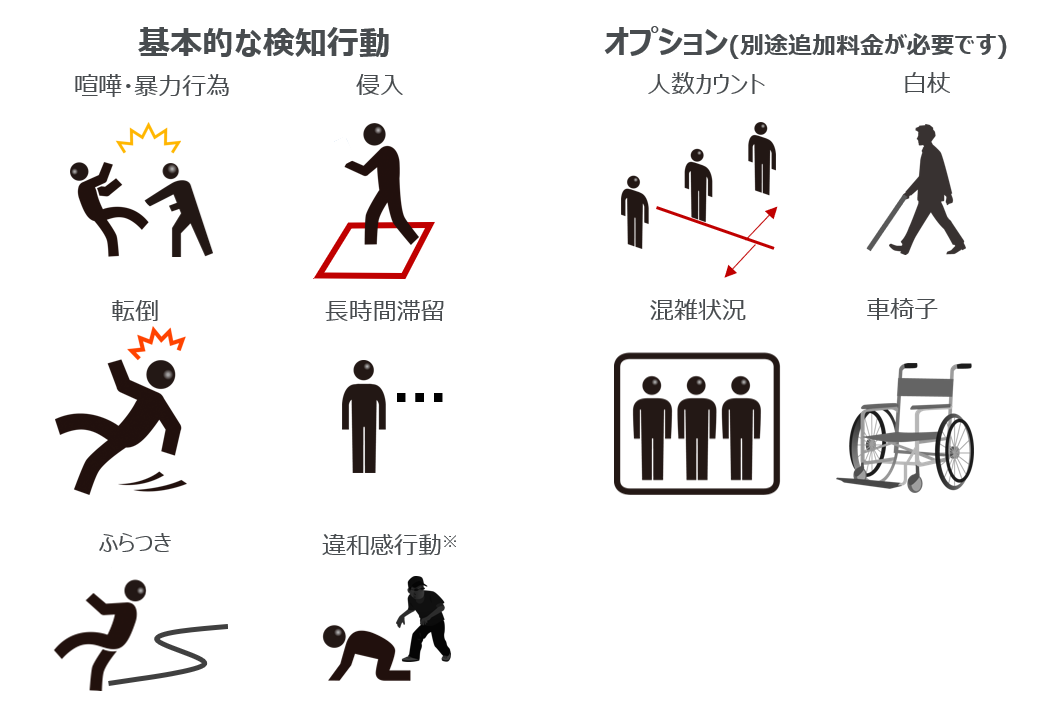 「転倒」「ふらつき」「酔っ払い」「喧嘩」「破壊行為」「蝟集・滞留」行動認識AIを用いてこれらの異常行動をリアルタイムで検知。+画角内で自律学習を行い通常行動から外れたものを違和感として検知。