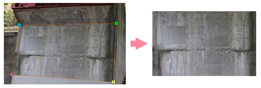 検知対象のインフラ構造物を撮影し、その画像を合成、補正を行った後、本サービスにてAIでの変状検知の実施が可能です。