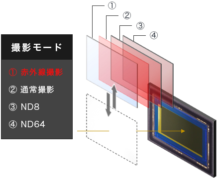 - IR透過フィルターを含む4枚のガラスフィルターで構成。IRカットフィルターを抜き差しすることにより赤外線撮影を実現。