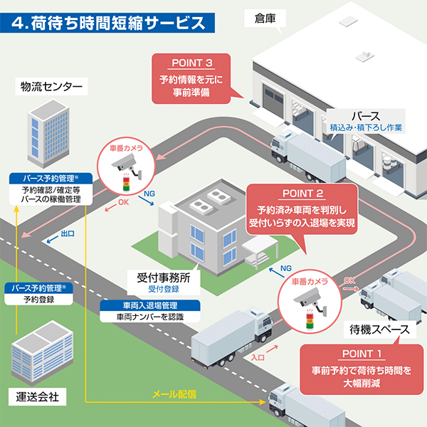 バースを事前に予約することにより、来場車両を分散させることができるため、トラックの待機時間を削減できます。