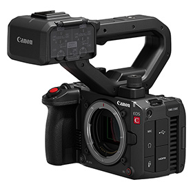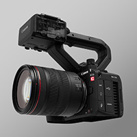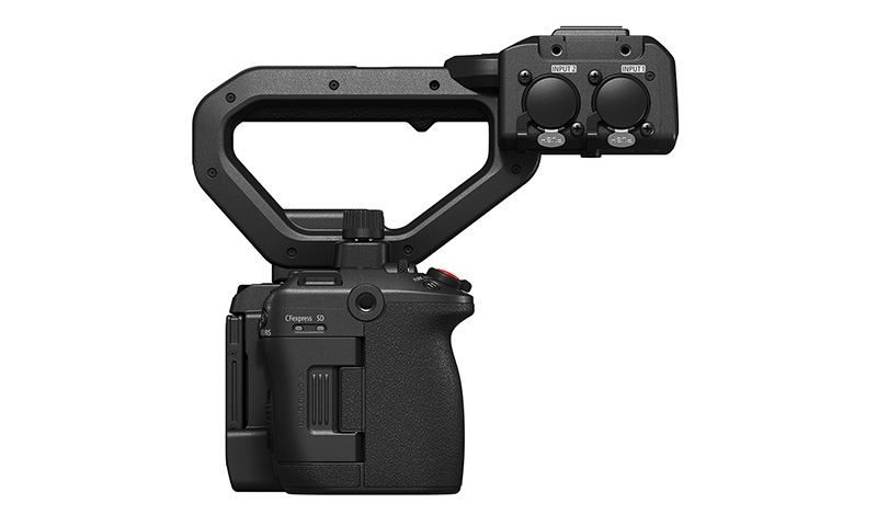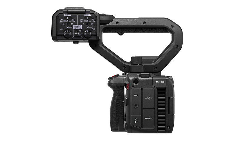 フラットで直線的なデザインのカメラボディーと同梱のハンドルユニットでさまざまな撮影スタイルに適応。タイムコード入出力端子や、XLR端子などのインターフェースを搭載しています。機動力が求められる撮影現場からシネマならではの本格的な制作現場まで幅広い映像制作に対応します。