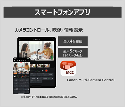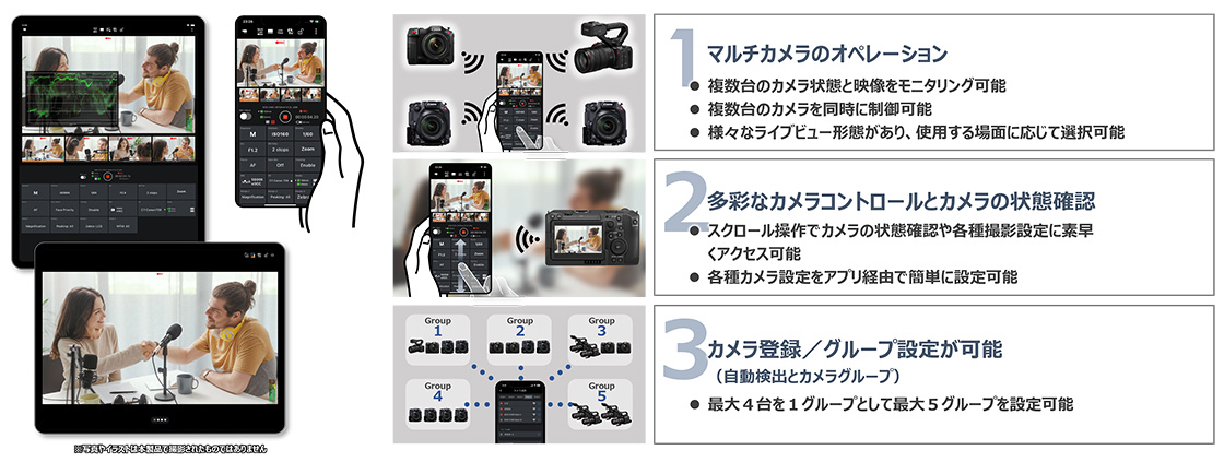 最大4台のCINEMA EOS/業務用カメラ/IPリモートカメラのカメラ状態と映像をiPhoneとiPadからモニタリング可能※。