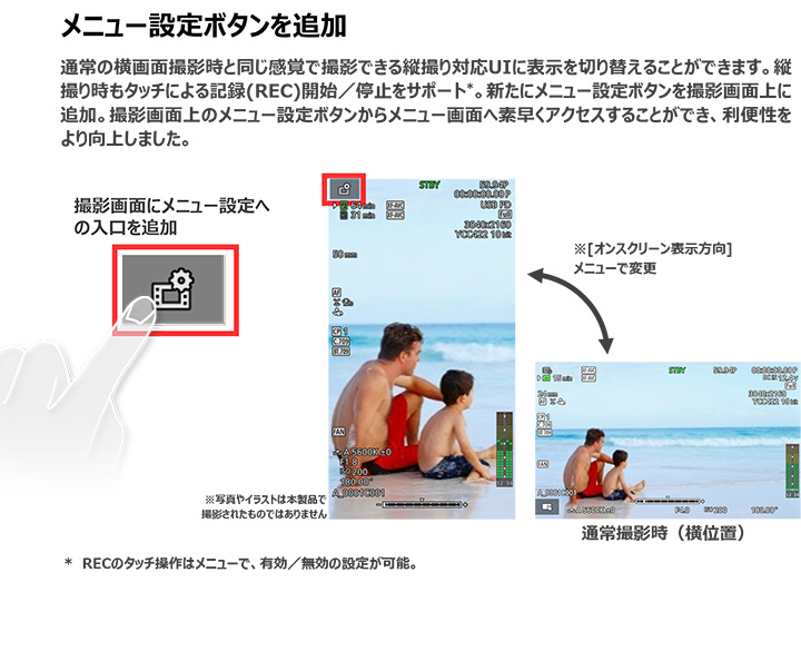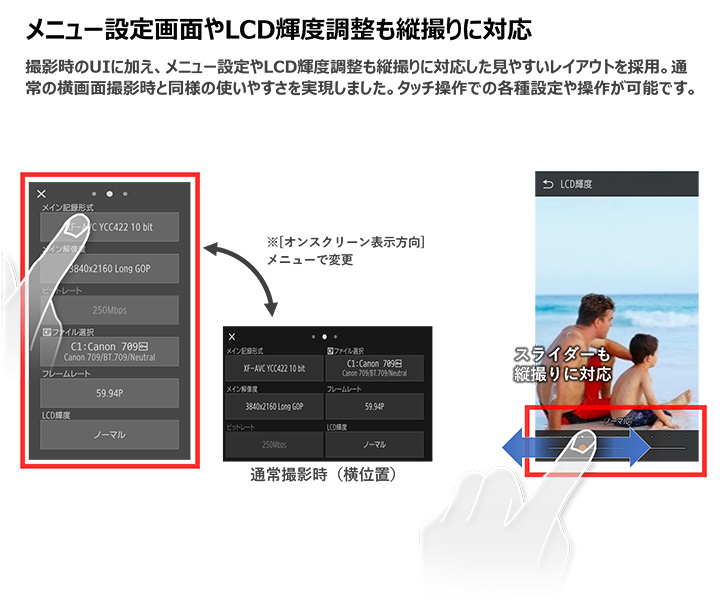 縦撮り専用のUIを搭載。通常撮影時(横位置)と同様の感覚で、主な記録系のメニューやLCD輝度の設定をタッチ操作で変更可能。