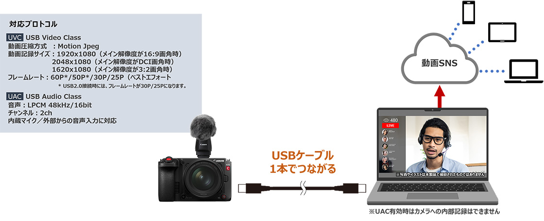 UVCは、高解像度化とフレームレート60P/50Pに対応。また新たにUACにも対応。EOS C50をビデオ通話やライブ配信カメラとして活用が可能。フルサイズセンサーとRFレンズがもたらす高画質や高感度、大きなボケ表現を活かした映像配信を実現します。