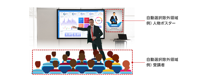 - 画角内の人物ポスターや受講者などの人物を自動選択除外領域に設定し追尾非対象とすることが可能。