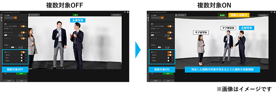 また、メインの被写体とサブの被写体がある程度(調整可)離れると、メインの被写体のみ撮影する「単体構図」でメイン被写体を自動追尾します。