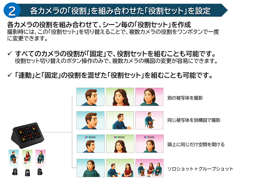 「一番右の人をウエストショットで」など、撮影したい被写体と構図といった各カメラの“役割”を指定できます。また、この“役割”を組み合わせた“役割セット”を設定し切り替えることで、あらゆるシーンに対応できます。