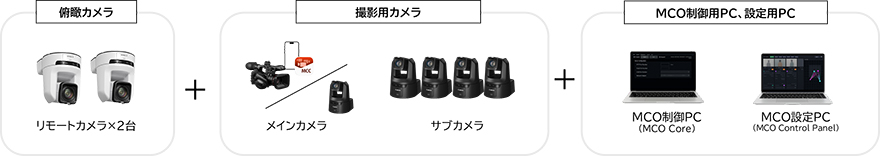 MCOを使用するためには、俯瞰カメラ2台、撮影用カメラ、制御/設定用のPCがそれぞれ必要です。MCOを制御するPCアプリケーション(MCO Core)にはFULL版/Lite版の2種類のライセンスがあり、それぞれ使用可能な機器構成や、機能・精度が異なります。