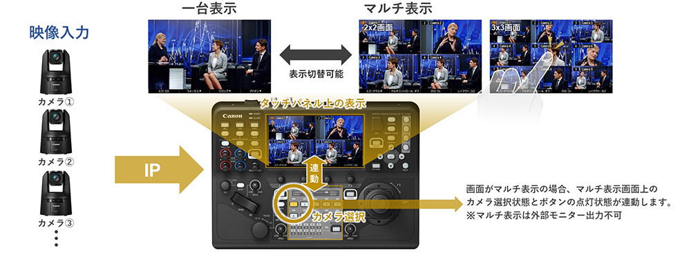 最大5台までのカメラを接続することができ、対象カメラを切り替えることでコントローラー1台で複数のカメラを操作できます。