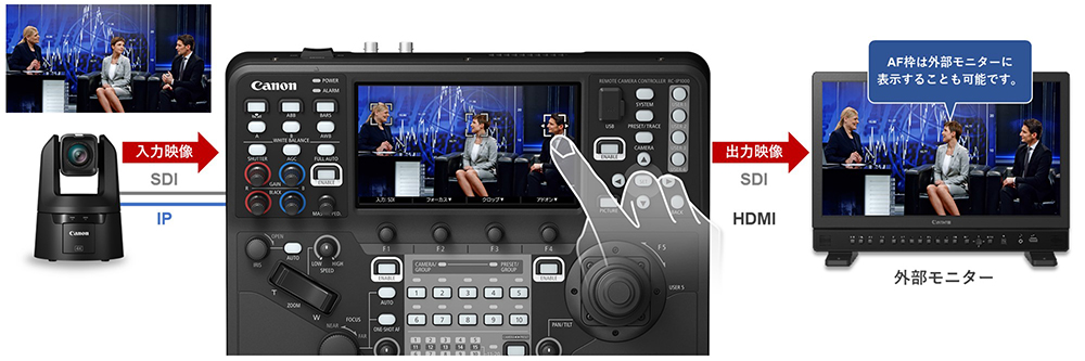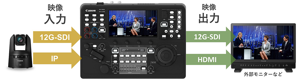 SDI/IPに関わらず入力された映像をSDI/HDMIで接続された外部モニターなどに出力することができるので、複数人でのライブオペレーションなど、大画面での映像確認が必要なシチュエーションであっても、操作中のカメラ映像をコントローラーから直接出力することが可能です。