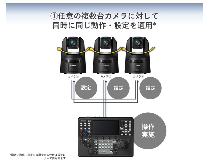 一台のコントローラーで最大200台までのキヤノンカメラを接続して操作可能。多台数カメラを管理するため最大10台までのカメラをまとめたカメラグループを最大20グループ設定することができます。