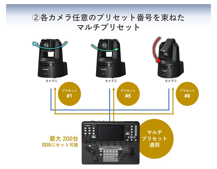 接続された複数台のカメラに対し、同時に同じ動作や設定を適用することが可能です。さらに、各カメラに設定されたプリセット番号を組み合わせたマルチプリセット機能を搭載し、複数台のカメラをあらかじめ決めた画角に素早く動かすことができます。