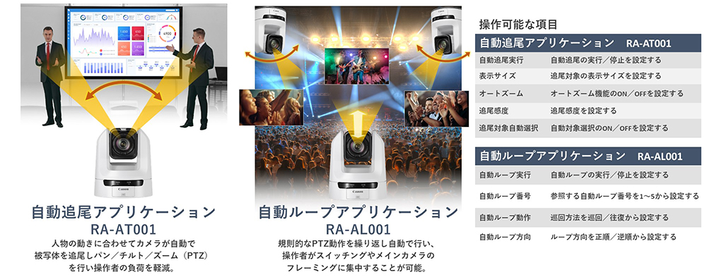 メニュー操作で自動追尾アプリケーション RA-AT001/自動ループアプリケーション RA-AL001の設定、実行、停止を行うことができます。