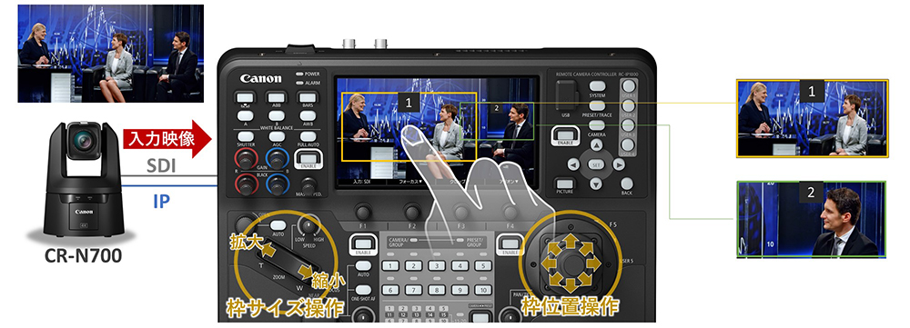 また、タッチ操作でクロップ枠の設置位置を操作や、パン/チルト操作部のENABLEボタンでモードを切り替えることで枠の設置位置/大きさをコントロールレバー/ズームロッカー操作し、素早くクロップ映像を作成することができます。