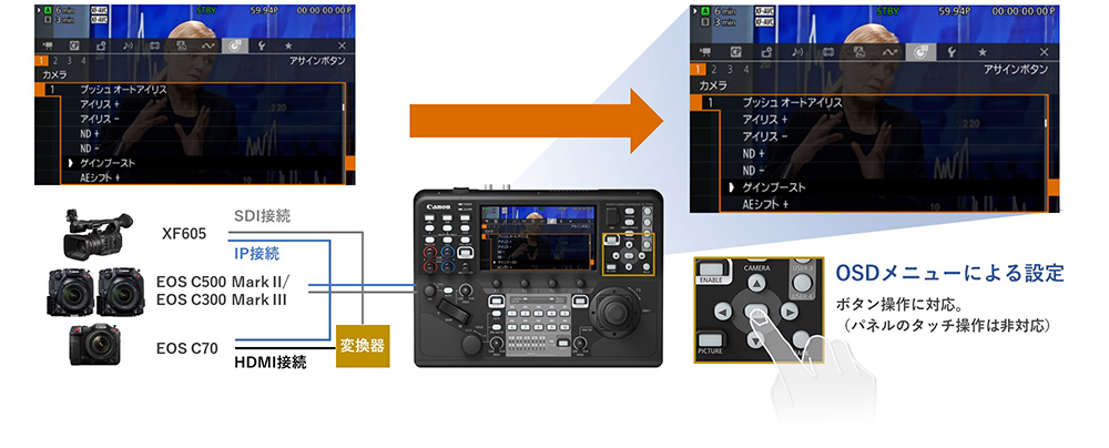 カメラのOSDメニューをタッチパネル上で表示、操作可能