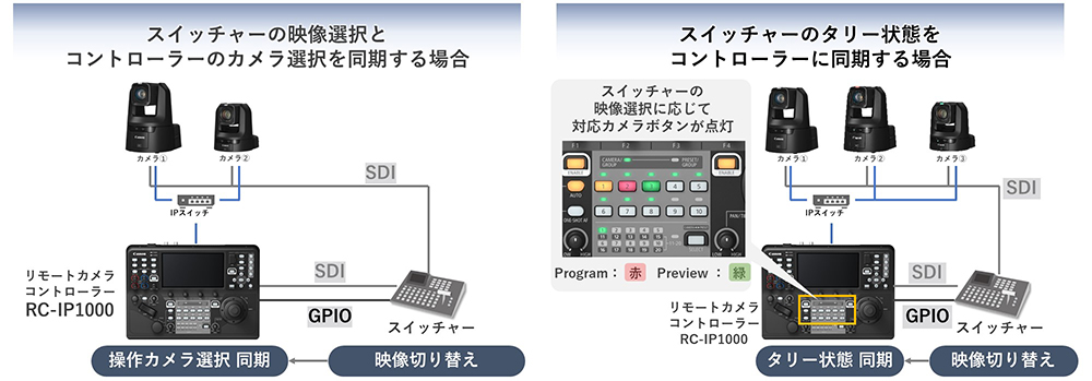 SDI/GPIOによるスイッチャー連携に対応。コントローラーのカメラ選択とスイッチャーの映像切り替えの同期、カメラ選択ボタンのタリー同期が可能です。
