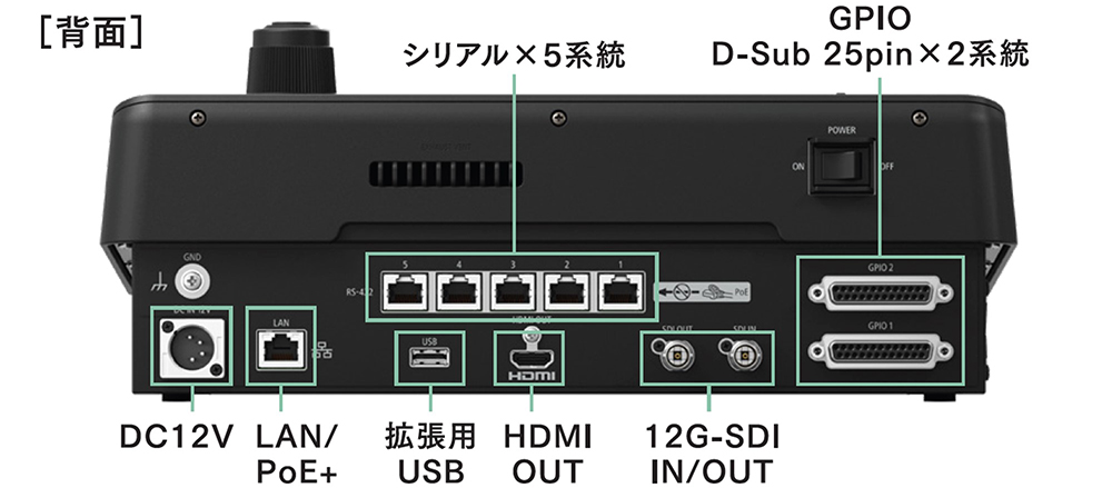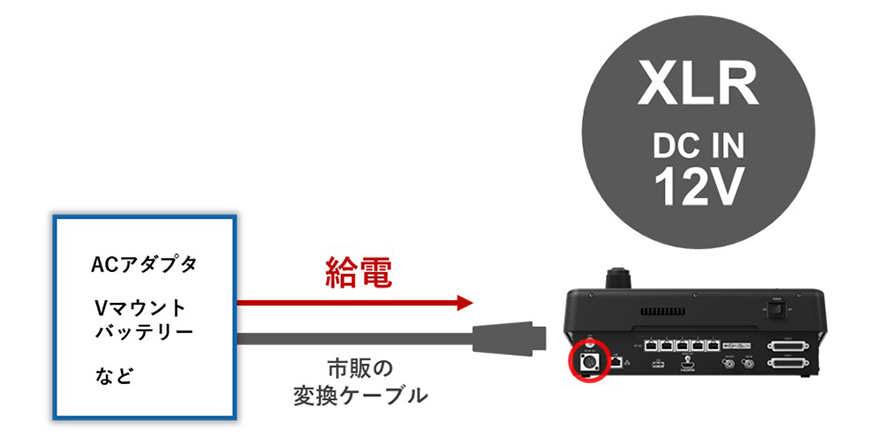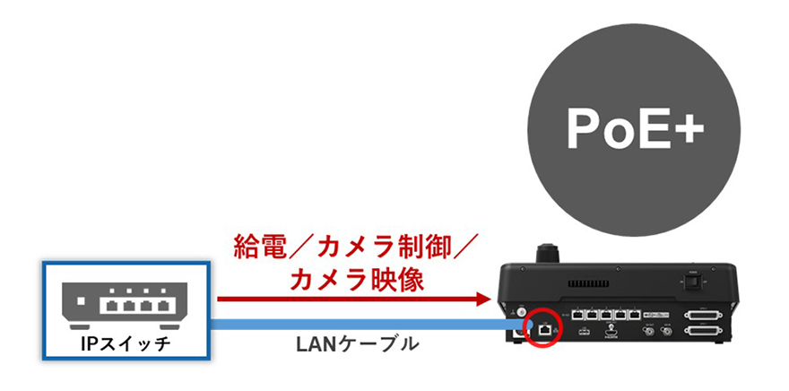 ケーブル1本で給電/制御/配信が可能なPoE+※・汎用性の高いDC 12V入力4ピンXLRコネクターを採用。