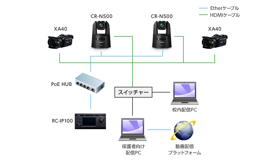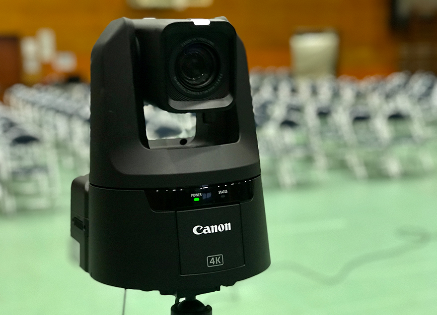 撮影機材は、体育館にリモートカメラ「CR-N500」2台、業務用ビデオカメラ「XA40」2台の構成。