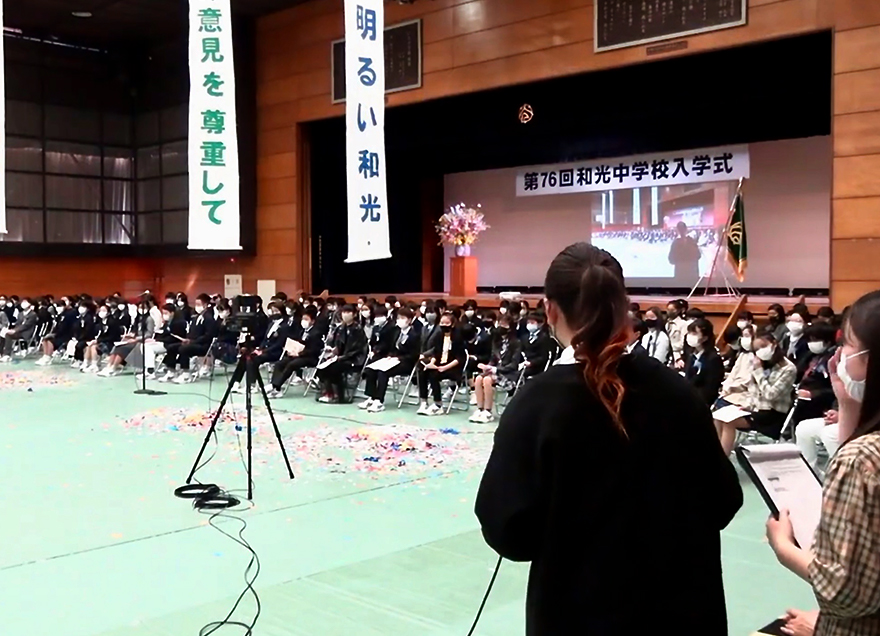 コロナ対策として式場内の人数を限定する為、在校生は教室からオンラインで参加する方式を採用、
