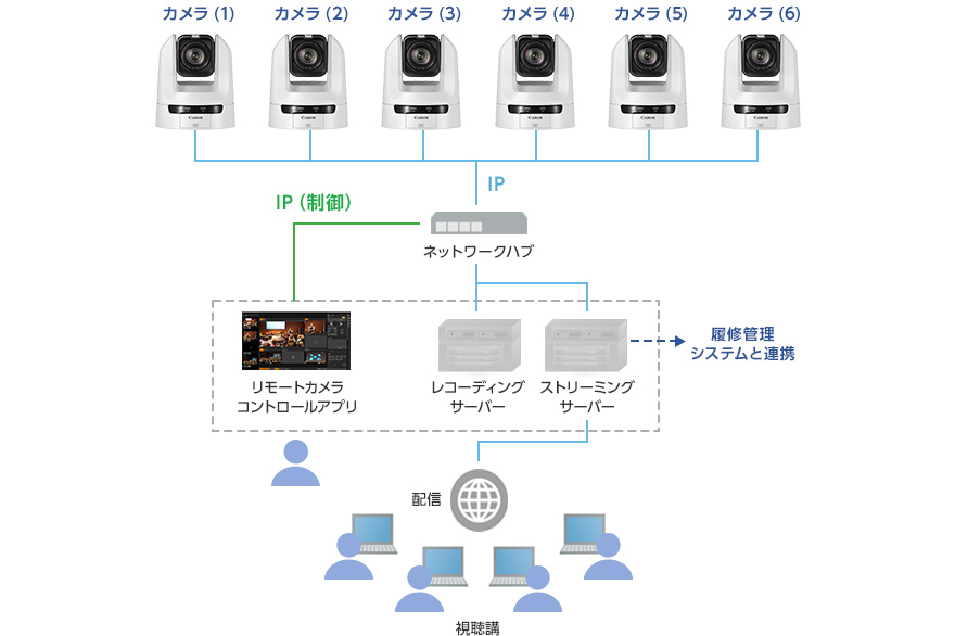 複数カメラをIPによる遠隔且つ一括制御で、講師と受講者との質疑応答など、両者を切り換えながら撮影できます。