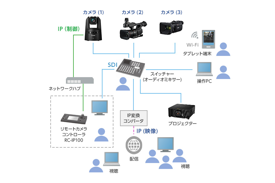IPで複数のカメラリモートコントロールできるため、少ない人員で撮影ができます。