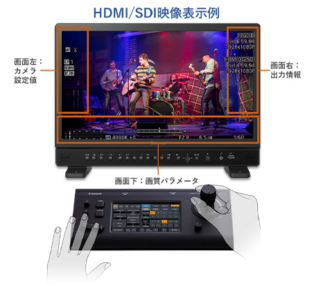 ハードコントローラ操作時に有効な、HDMIまたはSDI接続されたモニター上へOSD情報の重畳表示のON/OFF設定が可能。