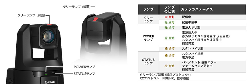 レンズ部の前面と後面にタリ―ランプを搭載し、カメラのステータスを分かりやすく知らせます。特に同時に複数のカメラが使用される放送や収録では、スイッチャーは、使用するカメラを頻繁に切り換えます。その際、タリーランプが赤く点灯することで、どのカメラが撮影中であるか、他のスタッフや出演者に知らせることができます。