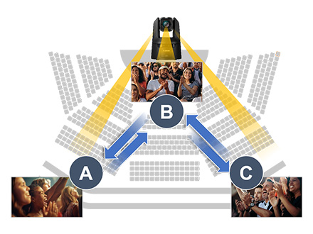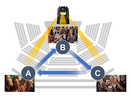 設定した目標位置(画角)と、指定した時間または速度の情報から、PTZ動作に要する時間を考慮し、連動した制御を行うことで、現在位置(A)からのPTZ同時スタート、目標位置(B)でのPTZ同時ストップを実現します。このようなPTZの操作性は、映像制作の現場において、演出意図や「撮りたい画」の要望に応えます。