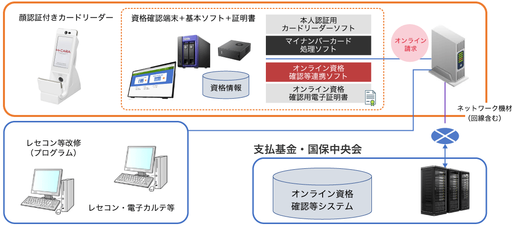 オンライン資格確認の利用には、顔認証機能付きカードリーダーの他、レセプトコンピュータに接続するための資格確認端末が必要です。 ハードウェア基準に準拠、Hi-CARAとの動作確認済み端末をご用意いたしました。今回ご用意した端末は、省スペース型になっており、受付スペースを考慮した端末となります。また1台の資格確認端末に最大4台まで接続することができ、業務の効率化に貢献します。