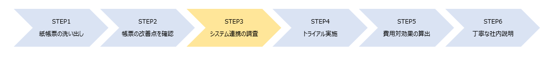 電子帳票のデータを社内システムと連携する必要があるかないか、必要な場合はその可否を調査します。システム連携にはAPIやCSV等が考えられますが、システムによってはデータ入出力がオプションで別途費用の掛かるものがあります。CSV入力が可能なシステムであれば、そのCSVフォーマットを用意できれば連携可否の判断が可能です。CSV入力不可のステムでもRPAなどで転記作業を自動化できる可能性があります。