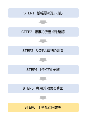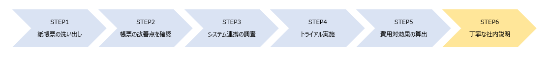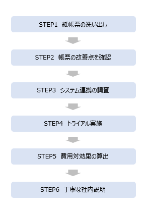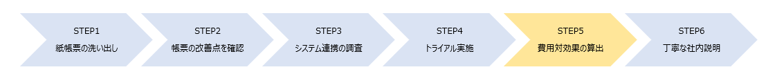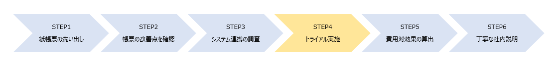 期待された効果が本当に得られるかを確認するためにトライアルを実施ます。トライアルの際は現在の紙帳票で行っている場合に掛かっている業務時間を予め算出し、電子帳票で行う場合に掛かる業務時間をトライアルから得ることが重要です。トライアルはITリテラシーの高い低いでそれぞれメンバーを選出することをおすすめします。また、電子化によるメリットには印刷コスト、保管コスト、検索時間、移動時間、紛失・欠損リスクの削減などもありますので、効果測定項目として盛り込んで下さい。