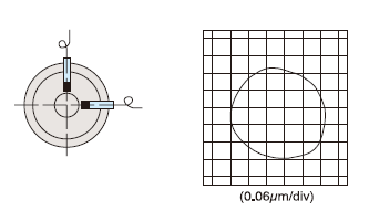 スラストプレートの中心により外周へ一定距離離れた位置での上下変位を電気マイクロメータで測定する。標準端面振れは1μm以下(オプションにより0.3μm以下可能)