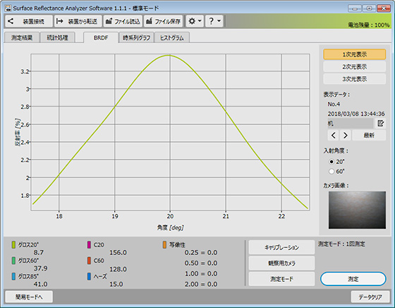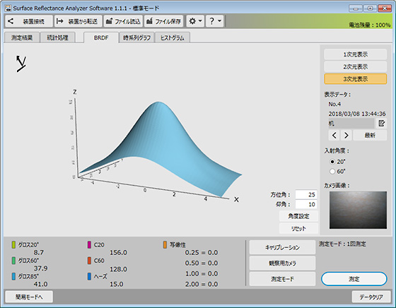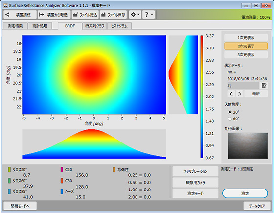 例:各指標の測定、1次元/2次元BRDFの表示、データの読み込みおよび統計処理、グラフ表示 etc.