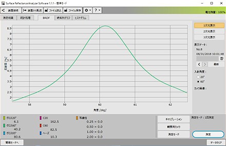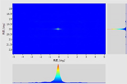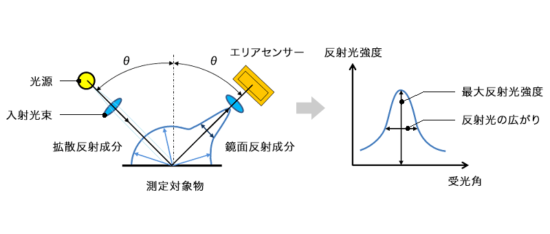 本測定装置では受光角20°あるいは60°に対して、正反射およびその近傍で測定された反射光強度の角度分布を取得することができます。
