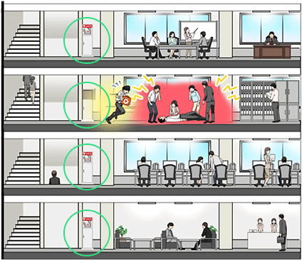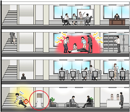 ビルの規模にもよりますが、オフィス単位や各フロアに1台ずつなど、セキュリティ毎にAEDを設置するケースが増えています。