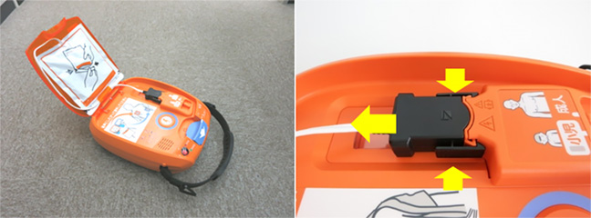 AED本体のフタを開け、コネクター​両側のつまみを持ち、スライドさせて引き抜きます。