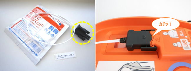 電極パッドに記載されている使用期限が確認できるよう本体フタ部分のホルダに差し込みます。電極パッドのケーブルを3ヶ所のケーブルガイドにセットします。