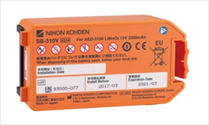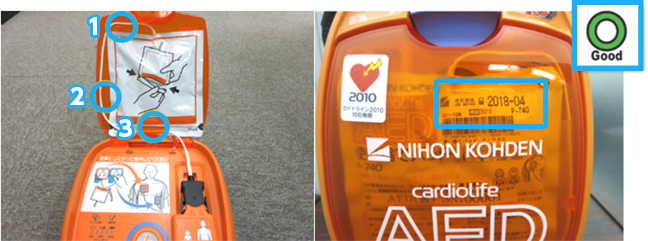 AED-3100の電極パッドの使用期限は約2年です。AED日常点検タグに記載されている電極パッドの使用期限とバッテリー​の装着日が記載されています。確認の上、交換期限前に必ず交換するようにしてください。