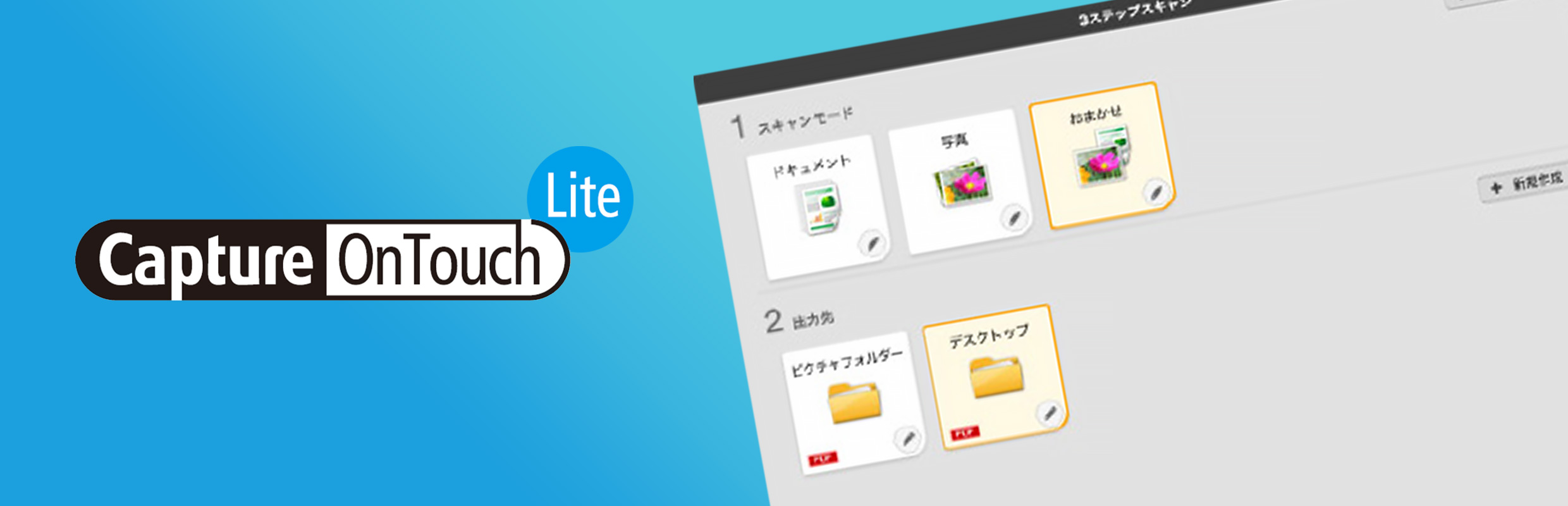 トップ画面の大きなアイコンから、スキャンモード、出力先を選んでスキャンするだけの3ステップで、簡単に使うことができます。