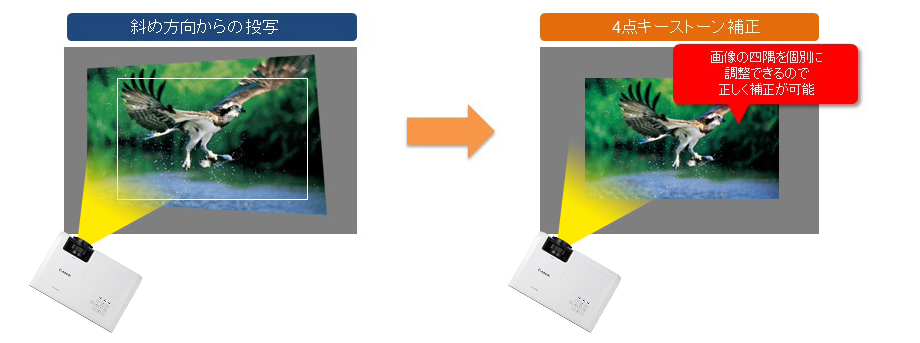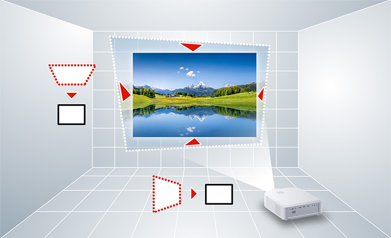 さらに、投写画像の四隅を個別に補正できる4点キーストーン補正機能を搭載。より細かな画面のゆがみ補正を実現します。